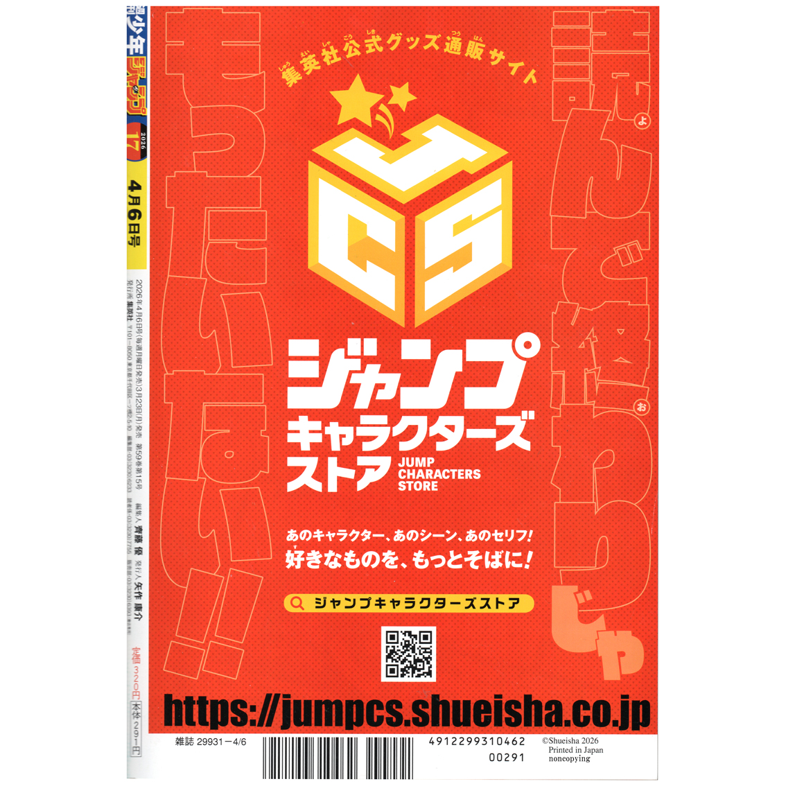 2026年4月6日号 週刊少年ジャンプ 17号になります。店頭陳列時や運搬時の傷・擦れ・ヨレがございますが、綺麗な状態です。