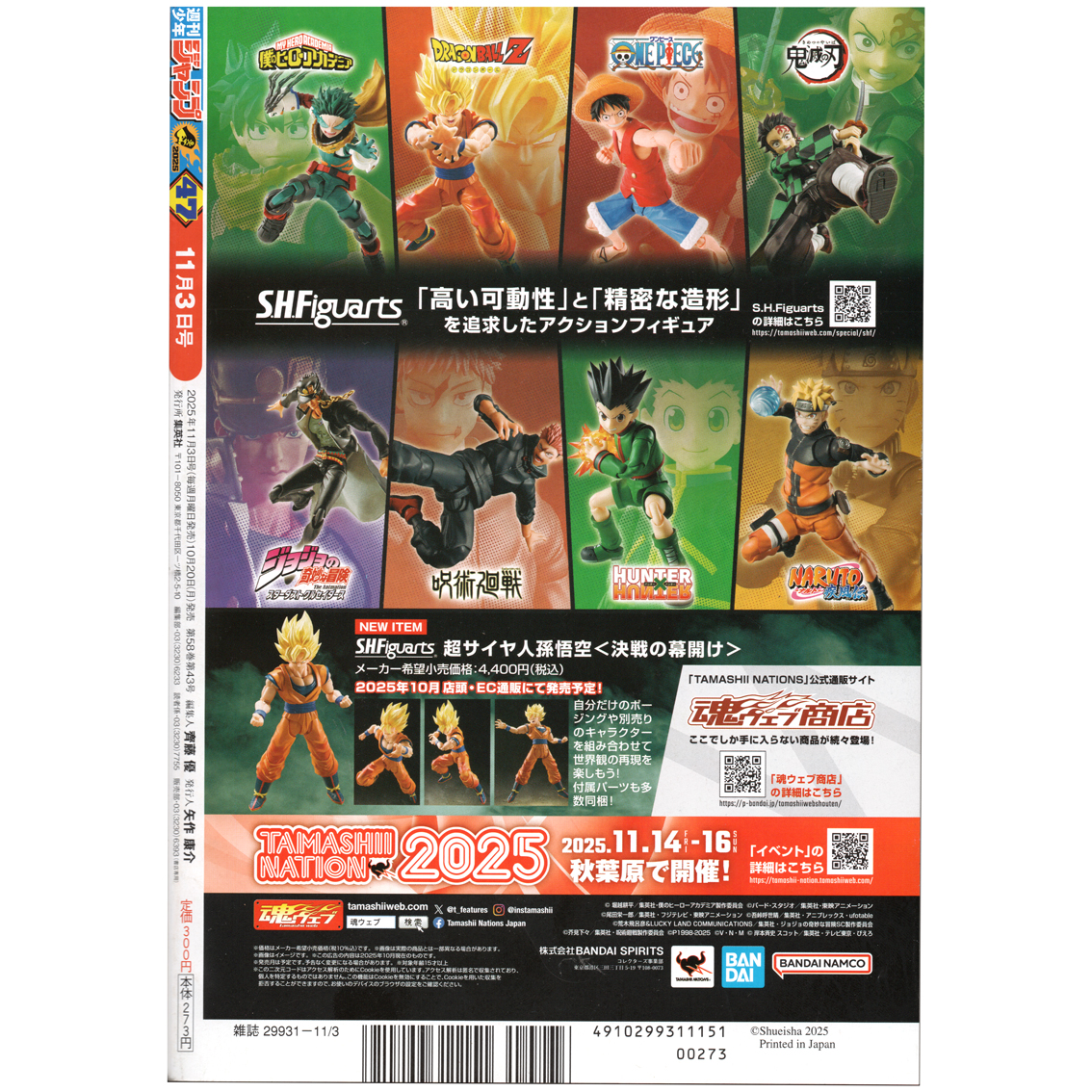 2025年11月3日号 週刊少年ジャンプ 47号になります。店頭陳列時や運搬時の傷・擦れ・ヨレがございますが、綺麗な状態です。