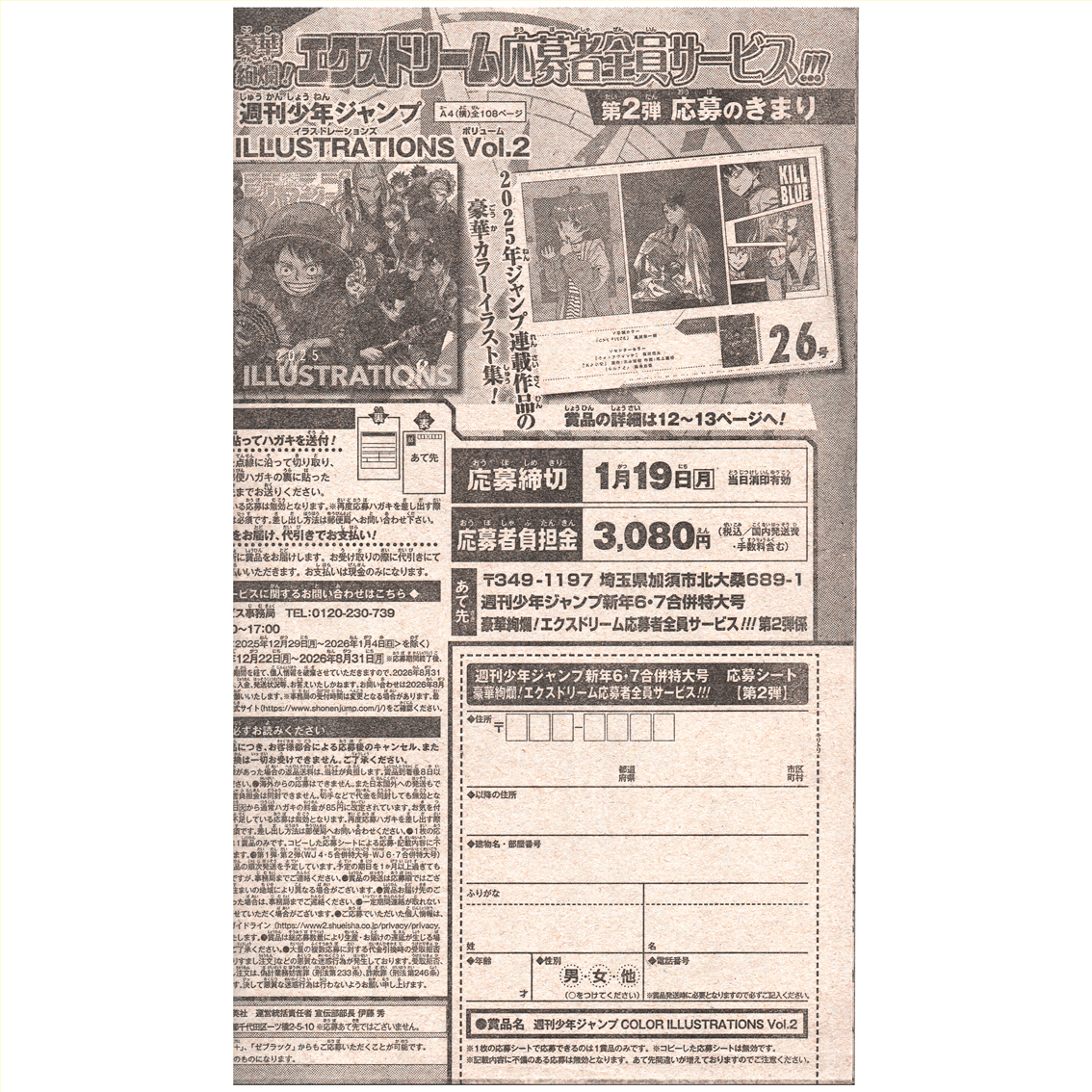 2026年1月29・30日合併特大号 週刊少年ジャンプ 新年6・7合併号になります。店頭陳列時や運搬時の傷・擦れ・ヨレがございますが、綺麗な状態です。