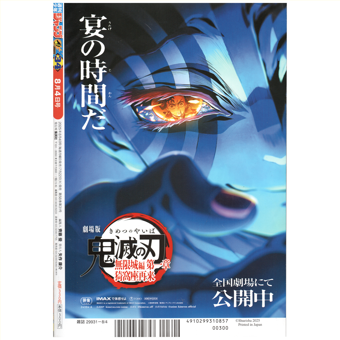 2025年8月4日号 週刊少年ジャンプ 34号になります。店頭陳列時や運搬時の傷・擦れ・ヨレがございますが、綺麗な状態です。