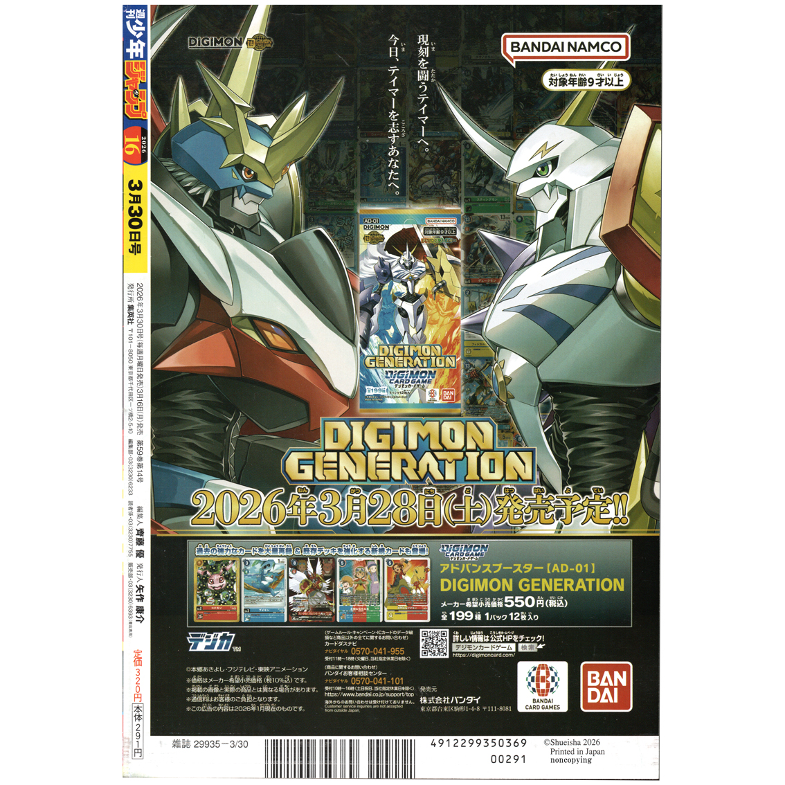 2026年3月30日号 週刊少年ジャンプ 16号になります。店頭陳列時や運搬時の傷・擦れ・ヨレがございますが、綺麗な状態です。