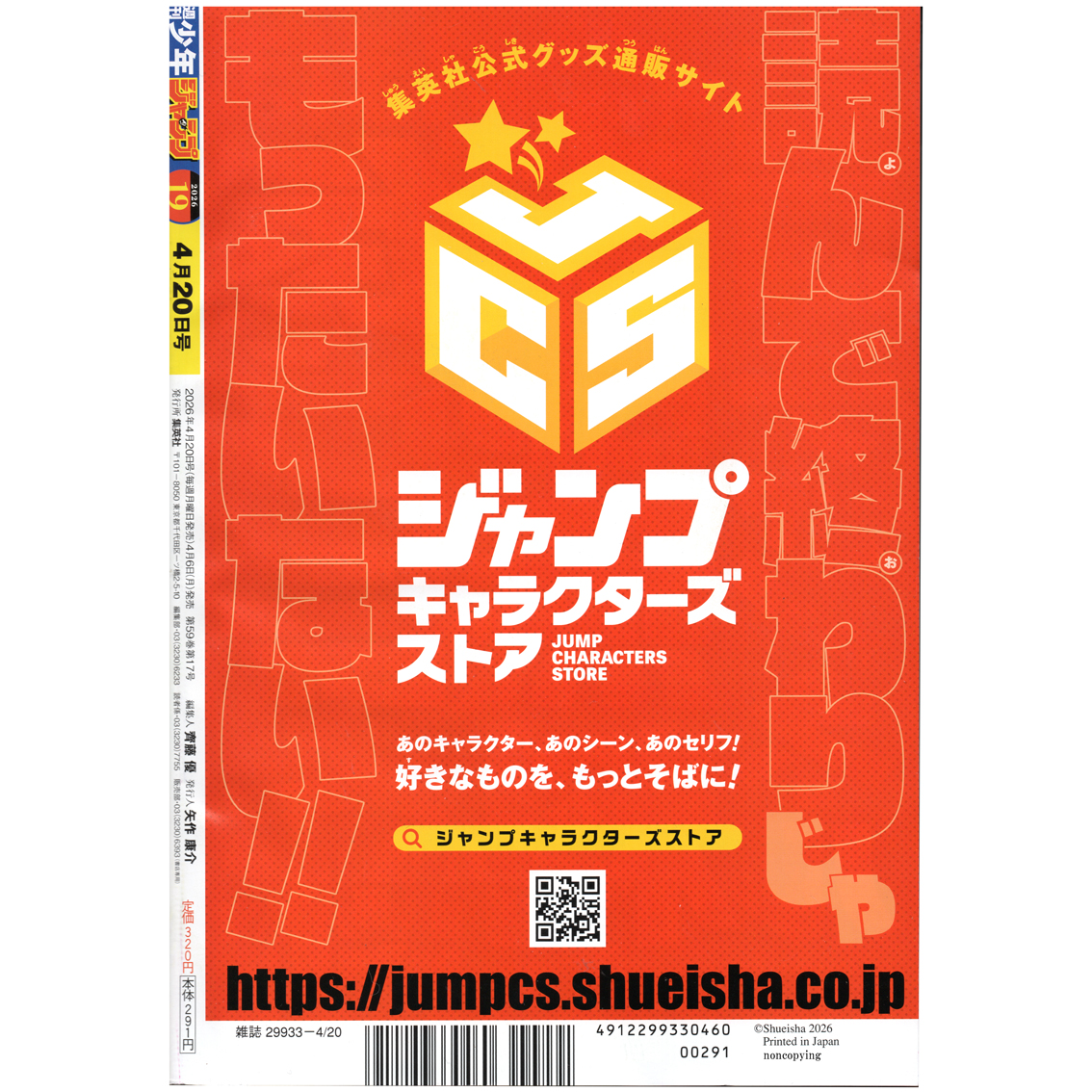 2026年4月20日号 週刊少年ジャンプ 19号になります。店頭陳列時や運搬時の傷・擦れ・ヨレがございますが、綺麗な状態です。